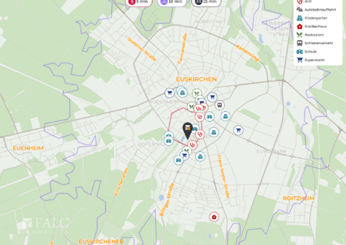 Die Immobilie befindet sich in einer gut angebundenen Lage in Euskirchen, die sowohl für Pendler als auch für Bewohner mit einem aktiven Lebensstil attraktiv ist. Die Anbindung an den öffentlichen Nahverkehr ist optimal, mit einer Bushaltestelle in nur ca. 150 Metern Entfernung. Für Autofahrer ist die Autobahnauffahrt A1 in etwa 4 Kilometern erreichbar, was eine schnelle Verbindung zu umliegenden Städten ermöglicht. Der nächste Flughafen ist der Flughafen Köln/Bonn, der in ca. 50 Kilometern erreichbar ist.