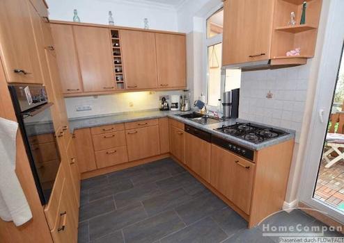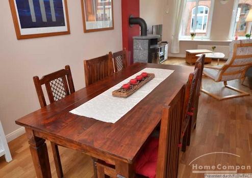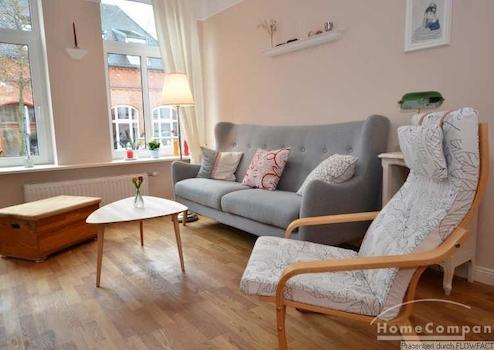 Dieses zauberhafte Wohnung in einem Altbremerhaus erstreckt sich über zwei Stockwerke. Vom geräumigen Eingangsbereich im Erdgeschoss gelangt man sowohl in das Wohnzimmer mit Essbereich, als auch in die vollausgestattete Küche des Hauses. Im Obergeschoss befinden sich zwei Schlafzimmer, die jeweils mit einem Doppelbett ausgestattet sind. Das Badezimmer verfügt über eine Eckbadewanne und eine barrierefreie Dusche. Ein separater Raum wurde zu einem begehbaren Kleiderschrank umfunktioniert. Vom Balkon der Küche aus hat man Zugang zum Garten.