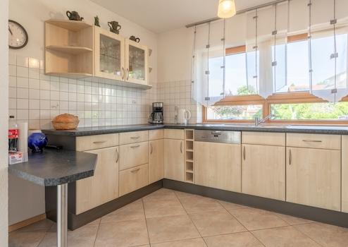 Voll ausgestattete Einbauküche im Anschluss an den Essbereich