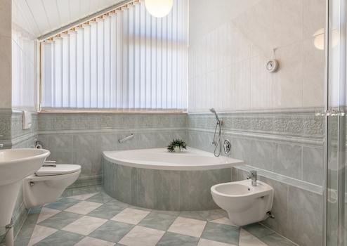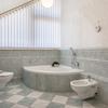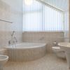 Modernes und komplett gefliestes Bad mit Dusche, Eckwanne, Bidet und WC