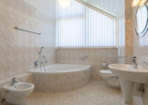 Modernes und komplett gefliestes Bad mit Dusche, Eckwanne, WC und Bidet