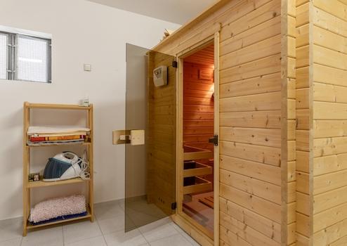 Ein großer, gefliester Keller beherbergt nicht nur praktische Räume, sondern auch einen Saunabereich – Ihre private Wellnessoase!