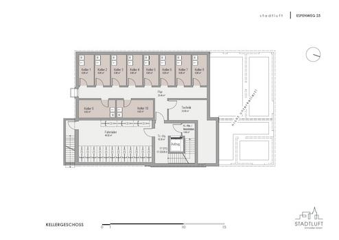 Im Kellergeschoss befinden sich die mechanisch belüfteten Abstellräume - zugehörig zu jeder Wohneinheit mit Podestflächen sowie Sanitäranschlüssen für Waschmaschine und Kondensattrockner (bei Bedarf können die Haushaltsgeräte auch in der Wohnung vorgerüstet werden).
