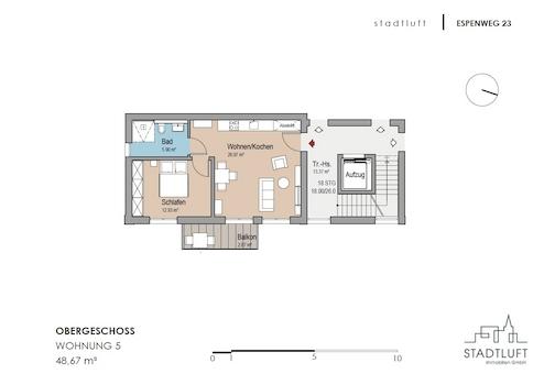 Diese helle 2-Zimmer-Wohnung im Obergeschoss bietet auf 48,67 m² einen offenen Wohn-/Essbereich mit integrierter Küche, ein Schlafzimmer sowie ein modernes Bad mit Dusche und Fenster. Der helle Wohn-/Ess-/Kochbereich öffnet sich zum sonnigen Balkon, der ideal zum Entspannen im Freien einlädt.
