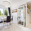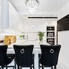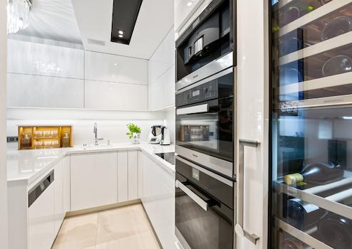 • hochwertige Einbauküche, mit Miele Geräten, eingebaute Kaffeemaschine, Weinkühlschrank und weiteren Highlights, gefliest, weiß, Vollausstattung, neuwertig, angrenzender Essbereich