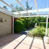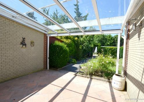 Der Außenbereich rundet das Gesamtbild harmonisch ab: Die überdachte Terrasse lädt zu entspannten Sommertagen ein und bietet einen schönen Blick in den Garten. Ein Weg führt direkt zur rückwärtigen Pforte – mit Zugang zum gemeinschaftlichen Weg und dem Garagenhof. Praktisch: Ein Geräteraum auf der Terrasse bietet zusätzlichen Stauraum.