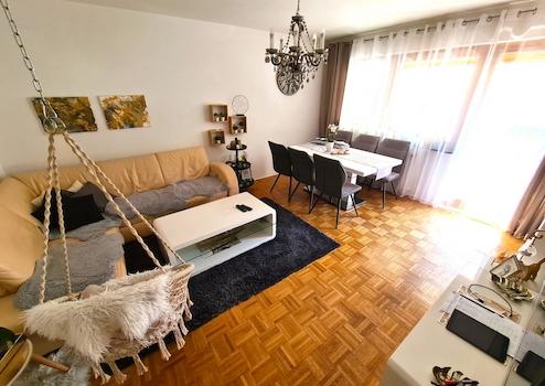 Rechts geht es in die Küche und auch auf den großen, durchgehenden Balkon. Auch vom daneben liegenden Wohnzimmer mit über 20 m² hat man direkten Zugang auf den großen Balkon.