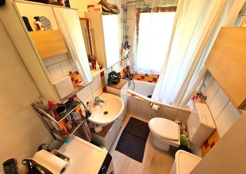 # modernisiertes Tageslicht-Badezimmer mit Badewanne und Duschabtrennung, WC, Handwaschbecken und Heizung (2011 erneuert)