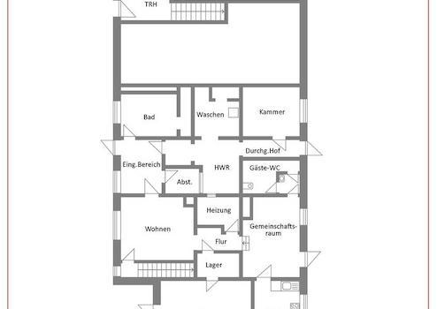 Im Erdgeschoss mit insgesamt ca. 109 qm Wohn- und Nutzfläche befinden sich Wohn- und Esszimmer, Bad und WC, Küche sowie Hauswirtschafts-, Lager- und Abstellräume. Im Obergeschoss befinden sich auf insgesamt ca. 171 qm Wohnfläche 7 Wohn-, Schlaf- und Kinderzimmer, Flur, Küche und Badezimmer. In den letzten Jahren wurden nur noch einzelne Räume im Erdgeschoss zu Wohnzwecken genutzt. Straßenseitig ist eine Garage angebaut, welche einen direkten Zugang zum Wohnhaus besitzt. Das Garagendach ist für eine Terrassennutzung geeignet. An der Ostseite bietet ein großer Carport Unterstellmöglichkeiten für weitere Pkw oder Wohnwagen bzw. Wohnmobil. Das Haus ist teilunterkellert. Die Brauchwasserentsorgung erfolgt über eine regelmäßig zu entleerende Klärgrube.