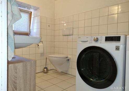 Im Erdgeschoss befinden sich neben der Küche auch ein großzügiges Bad mit Wanne und Duschkabine. Das WC und die Möglichkeit zum Aufstellen von Waschmaschine/Trockner runden das Angebot auf dieser Ebene ab.