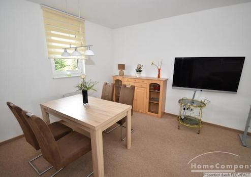 Das großzügige Wohnzimmer ist zweigeteilt und besteht aus einem Essbereich mit TV-Gerät und dem Wohnbereich mit Couch. Besonders angenehm ist der direkte Zugang zum Balkon vom Wohnzimmer aus.