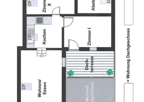 Darüber hinaus befindet sich im Dachgeschoss eine kleine Wohnung mit separatem Zugang, die mit einer Wohnfläche von ca. 48,01 m² über 2 ½ Zimmer, Küche, Duschbad / WC und Dachterrasse verfügt.