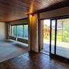Wohn-Esszimmer mit offenem Kamin und Zugang zur teilweise überdachten Terrasse