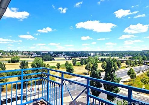 Die Wohnung liegt direkt am Käthe-Kollwitz-Ufer vor der Waldschlösschenbrücke. Da es das letzte Haus vor der Brücke ist, hat man einen unverbauten Blick vom Wohn- und Speisebereich sowie Balkon auf die Elbauen.