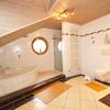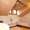 Schaumkronen ahoi: Ein geschmackvolles Träumchen, das Sie zum Entspannen einlädt, wartet in Weiß mit warmen Beigetönen, harmonierend mit der warmen Holzvertäfelung an der Decke. Eine ebenerdige Dusche für die Erfrischung zwischendurch und eine große Eckbadewanne für ausgiebige Schaumbäder werden ergänzt durch ein WC und ein großes Waschbecken. Durch das Fenster stylen Sie sich bei Tageslicht.