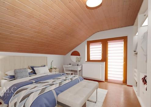 Über die offene, moderne Bucheholz-Treppe gelangen Sie in das Obergeschoss mit Studio-ähnlichem Zimmer mit Klimaanlage und Anschluss zum Westbalkon. Gönnen Sie sich hier ein Gläschen Wein und schauen Sie zu, wie der Tag ausklingt.