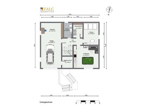 Im Untergeschoss finden Sie einen großen Hobbyraum, ein modern gehaltenes Tageslichtbad mit ebenerdiger Dusche und WC komplettiert dieses Séparée für den Teenie oder die Schwiegermutter. Ein Hauswirtschaftsraum erleichtert die Haushaltspflichten, lässt auch größere Einkäufe zu und unansehnliche Gegenstände wie Besen oder Staubsauger verschwinden, direkt daneben befindet sich der Heizungsraum. Eine Werkstatt in der Garage, die Sie nach Ihrem Bedarf einrichten können, lässt das Handwerker-Herz höher schlagen, den Hausanschlussraum finden Sie nebenan.