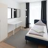 Die Wohnung verfügt über drei separate Schlafzimmer, jeweils möbliert mit komfortablen Betten, Kleiderschränken und Arbeitsbereichen.