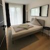 Modern möbliertes Apartment mit grozügigem Wohn/Schlafbereich, möbliert mit Doppelbett, Kleiderschrank und Essbereich. Bad mit Fenster und Badewanne. Separate, voll ausgestatte Küche.