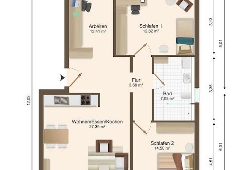 Für ein wohliges Raumklima sorgt die Fußbodenheizung mit Einzelraumsteuerung. 3-Scheiben-Isolierverglasung bei den Fenstern schluckt etwaige Geräusche von draußen und bietet Topwerte in Sachen Energieeffizienz.
