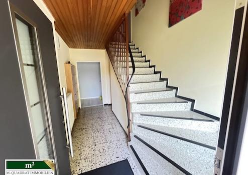 An viel Grün vorbei führt sie der Weg zum Hauseingang. Durch die 2018 erneuerte, moderne Haustür treten sie in die gemeinschaftliche Diele der Wohneinheiten ein. Von hieraus führt die massive Steintreppe zur oberen Wohneinheit und geradeaus ist der Eingang zur Erdgeschoss Wohnung. Neben dem Wohnungseingang liegt der Zugang zum Keller. Im Keller gibt es für jede Partei einen eigenen, zugeordneten Raum sowie die gemeinschaftliche Waschküche, den Heizungsraum und den Anschlussraum. Der Keller ist auch von außen zugänglich.