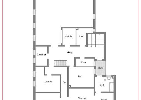 Das Obergeschoss beeindruckt mit seinem ca. 180 qm großen ehemaligen Tanzsaal inklusive Schänke, einer geräumigen Bar, einem weiteren Zimmer, das auch als Büro genutzt werden kann, sowie zwei Abstellräumen. Die ehemalige Betreiberwohnung auf dieser Ebene besteht aus drei Zimmern, Küche, Bad und einem kleinen Balkon.
