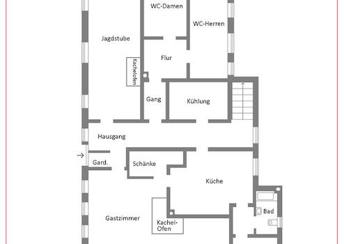 Im Erdgeschoss verteilen sich ca. 350 qm auf großzügige Räume, die durch zwei traditionelle Kachelöfen zusätzlich für wohlige Wärme und Gemütlichkeit sorgen.
