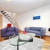 Ein Traum mitten in der Stadt! Mit dem privaten Aufzug gelangen Sie bequem und sicher auf die 5. Etage in Ihre Wohnung, Die Wohnung bietet auf zwei Ebenen alles um Ihren Aufenthalt in Düsseldorf unvergesslich werden zu lassen. Im 5. OG gelangen Sie in den großzügig geschnittenen Wohnbereich mit französischem Balkon. Ausgestattet mit feinsten Designermöbeln haben Sie eine gemütliche Sitzecke mit Sofa und einem Sessel, das Smart-TV inklusive, Teufel-Soundbar und Highspeed-Internetzugang. Der Esstisch bietet Platz für vier Personen. Die offene Einbauküche genügt höchsten Ansprüchen, alle Geräte wie Kochzone, Backofen, Spülmaschine sind von Gaggenau, die große Kühl-Gefrier-Kombination ist von Liebherr. Das anschließende Bad bietet Ihnen eine große Eckbadewanne mit Duschvorrichtung, Waschtisch und Hänge-WC. In einer Nische ist eine Waschmaschine mit integrierter Trocknerfunktion installiert. Unter der Treppe zum Schlafbereich im Dachgeschoss ist der HomeOffice Schreibtisch mit einem bequemen Bürosessel platziert. Der Schlafbereich im oberen Geschoss ist mit einem Doppelbett (160 x 200 cm) und einem sehr geräumigen Einbauschrank für Ihre persönliche Kleidung und Wäsche eingerichtet. Vom Schlafzimmer gelangen Sie auf den Dachbalkon mit herrlichem Blick über die Dächer Richtung Medienhafen und Innenstadt. Das separate WC der Marke Villeroy& Boch viClean-U rundet die perfekte Ausstattung auf diese Etage ab.