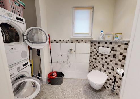 Im Erdgeschoss befindet sich der Flur, das Schlafzimmer, das moderne Badezimmer mit angrenzender Ankleide, sowie ein Gäste WC und ein Vorratsraum.