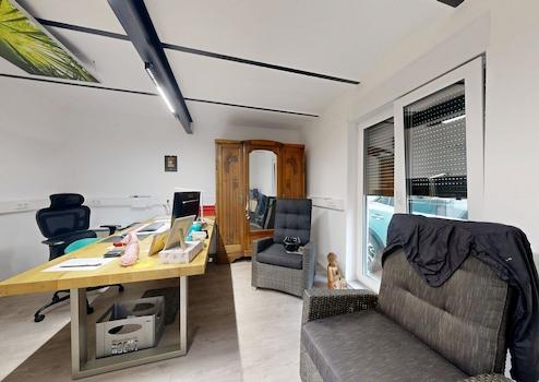 Hinter dem Haupthaus befindet sich die umgebaute Scheune mit Carport für Ihr Fahrzeug, sowie ein mordernes Büro und eine angrenzende Werkstatt. In zweiter Ebene auf dem Scheunenboden gibt es weitere Staufläche von ca. 68qm.