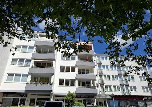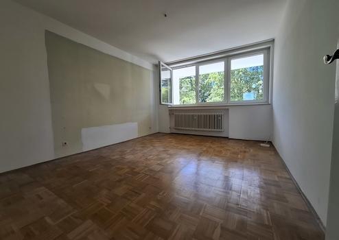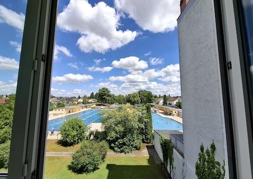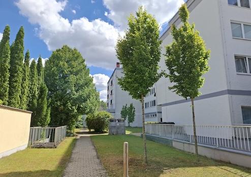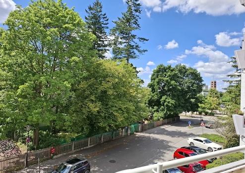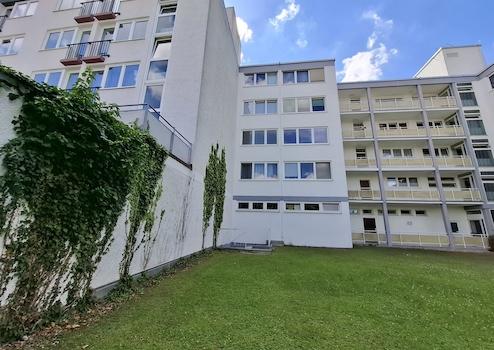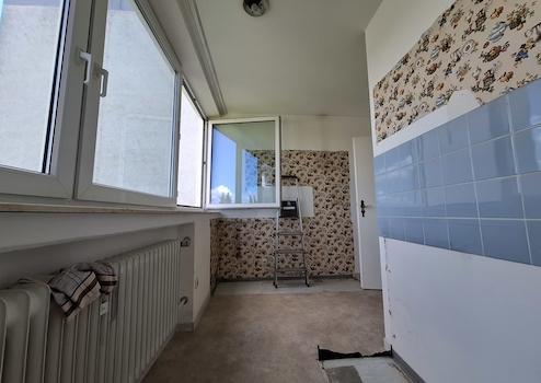 Sehr helle, renovierungsbedürftige, gut geschnittene 3-Zimmer mit Westbalkon auf Erbpacht; 2.OG; Ost-West-Ausrichtung; Ostseite mit Blick auf das Freibad; Aufzug von 2020; Wärmeerzeuger von 2012; Massivbauweise; Duplex-Stellplatz unten; Holzverschlag-Kellerabteil mit Fenster;