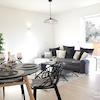 Das Herzstück der Wohnung ist das großzügige Wohnzimmer mit einem großen südlich ausgerichteten Panoramafenster, das sich komplett öffnen lässt. So entsteht ein offenes Wohngefühl mit Blick ins Grüne und direktem Zugang zur umlaufenden Dachterrasse mit LED-Beleuchtung – ideal zum Grillen oder Entspannen nach einem langen Arbeitstag.