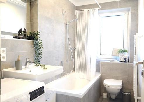 Das Bad wurde ebenfalls modernisiert und ist mit einer großzügigen Dusche sowie einer Waschmaschine ausgestattet.