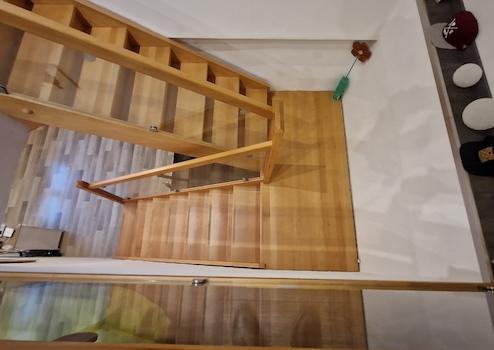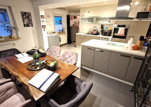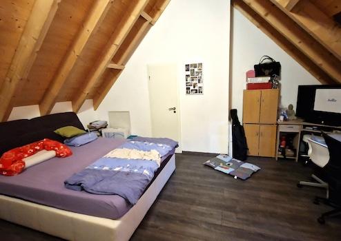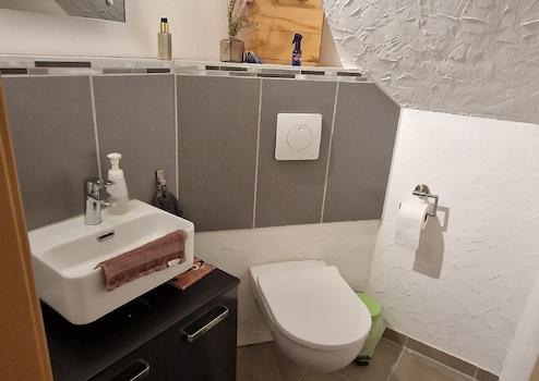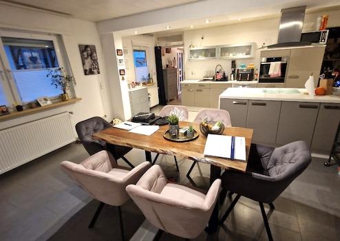 Viele positive Faktoren prägen das Gesamtbild dieser Immobilie. Angefangen von der sehr guten Raumaufteilung mit an-sprechenden Raumgrößen, besondere Ambiente auf jeder Wohnebene sowie auch im technischen Bereich der auf dem zeitgemäßen Stand ist. Kurzum, das Haus wurde ab 2011 komplett Grundsaniert. 2018 wurde das Dach komplett erneuert und mit 25 cm Dämmung versehen, da dieser Bereich ja als Wohnraum hinzugewonnen wurde. Die Kunststofffenster im Haus wurden 2014 und 2018 komplett erneuert. Die Dachfenster im Dachstudio verfügen über elektrische Öffnungen sowie Rollläden. Diese kann man auch mittels einer Zeituhr beliebig einstellen. Zu guter Letzt wurde die Gasheizung 2022 komplett erneuert, was sich auf jeden Fall auch bei den Verbrauchskosten stark bemerkbar macht. Somit hat man in den kommenden Jahren keinerlei Investitionen zu tätigen, was auf jeden Fall ein positiver Effekt ist. Das Haus befindet sich in einer kleinen Wohnanlage mit 4 Parteien die sich alle bestens verstehen und auch einen umgängliches miteinander haben. Über den Gemeinschaftshof haben alle 4 Wohneinheiten Ihren Zugang zum Haus. Auch wenn das Haus keinen Garten hat, ist man innerhalb einer Minute in Felder und Wiesen, was auch gerade für Hundebesitzer ein Traum ist. Das Haus unterteilt sich wie folgt. Über den Eingangsbereich gelangt man in das Gäste-WC, in die großflächige Garage mit elektrischem Tor, wo genug Platz für Fahrräder, PKW und Holzlagerung für den Kaminofen vorhanden. Weiteres geht es vom Eingangsbereich auch in die Wohnküche mit kleinem Abstellraum und Schwedenofen der an kalten Tagen für sehr angenehme Wärme und ein tolles Wohngefühl sorgt. Die vorhandene Einbauküche und der Schwedenofen sind im Kaufpreis schon enthalten. Im Obergeschoss befinden sich 2 großräumige Zimmer jeweils mit Balkon sowie ein ansprechendes Bad mit großer Badewanne, Dusche, Waschbecken, WC und Waschmaschinenanschluss.