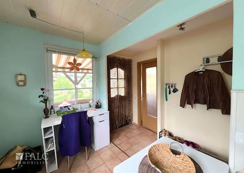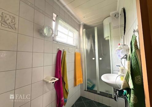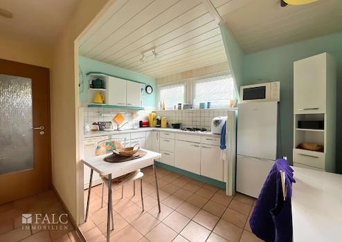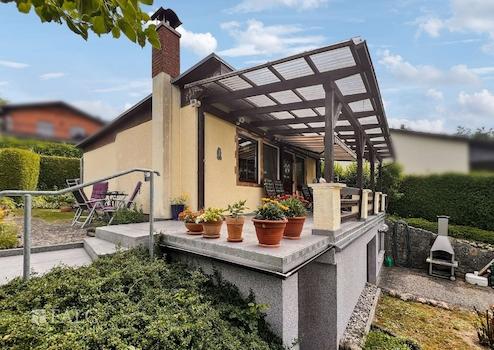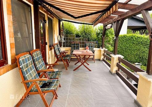 Zusätzlichen Stauraum bieten zwei Kellerräume. Ein kleinerer Raum eignet sich ideal als Abstellfläche oder Vorratskammer, während der zweite Kellerraum aktuell als Wasch- und Lagerraum für Gartenmöbel genutzt wird. Direkt vor dem Eingangsbereich befindet sich eine überdachte Terrasse, die zu entspannten Stunden im Freien einlädt.