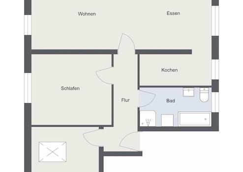 Aufteilung: Flur, Schlafzimmer, Kinderzimmer, Bad, Wohnzimmer mit offener Küche