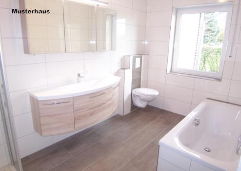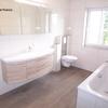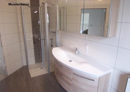 Das geschmackvoll gestaltete Badezimmer überzeugt mit einer hochwertigen Ausstattung: einer eleganten Wanne, einer bodentiefen Dusche mit Ganzglastür, einer großzügigen Waschtischanlage mit integriertem Möbel sowie einem wandhängenden WC. Eine deckenhohe, stilvolle Verfliesung sowie hochwertige Armaturen runden das Ambiente ab. Auch das Gäste-WC ist hochwertig ausgestattet – mit wandhängendem WC, Waschtisch mit Halbsäule und einheitlicher Verfliesung.