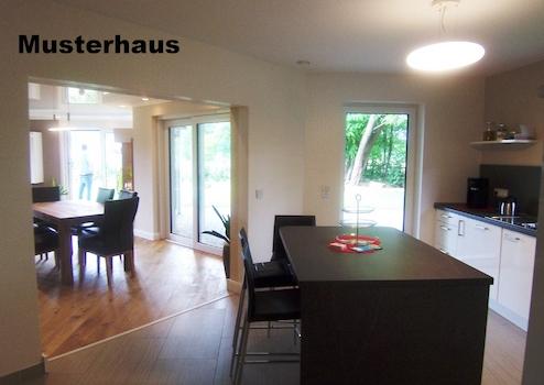 Die angrenzende Küche ist offen gestaltet, kann auf Wunsch jedoch mit einer Schiebetür separiert werden. Ein direkter Zugang führt in den großzügigen Hauswirtschaftsraum, von dem aus Sie sowohl die Garage als auch den Garten erreichen. Die Küche lässt sich ideal mit einer hochwertigen Einbauküche ausstatten – wir beraten Sie gerne in Zusammenarbeit mit unserem Partner-Küchenstudio.