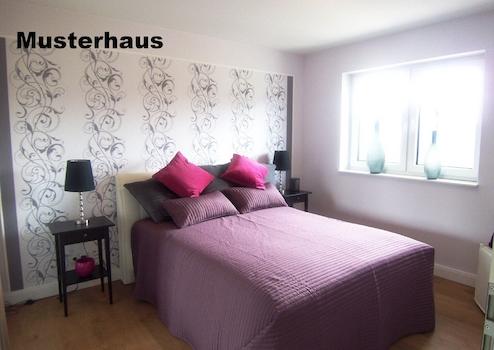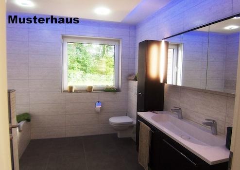 Der Grundriss ist ideal für modernes, komfortables Wohnen auf einer Ebene: Das Erdgeschoss bietet ein geräumiges Schlafzimmer und ein luxuriös ausgestattetes Badezimmer mit bodentiefer Dusche, Doppelwaschbecken mit stilvollen Möbeln, Hänge-WC sowie einer Wannenanlage – alles geschmackvoll und deckenhoch gefliest.