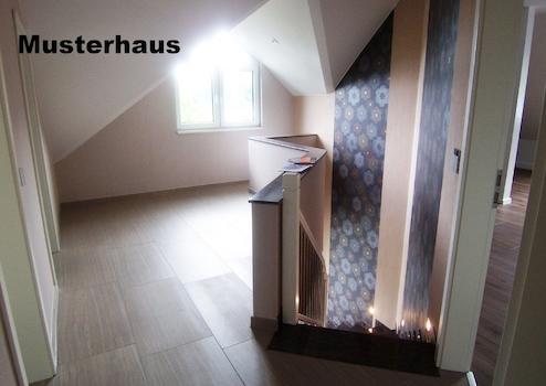 Im Obergeschoss befinden sich ein weiteres Schlafzimmer, ein großzügiges Wohnstudiozimmer, ein modernes Duschbad mit bodentiefer Dusche sowie der Technik- und Heizungsraum.