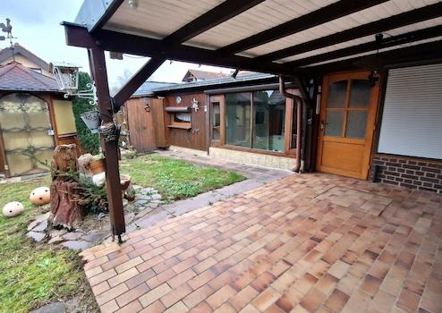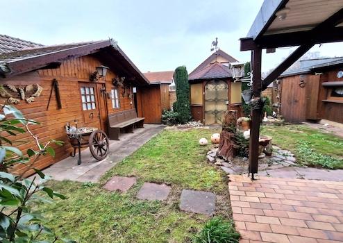 Besondere Highlights der Immobilie sind der Garten mit Gartenhäuschen, die Terrasse, ein Wintergarten mit Sommerküche und eine geräumige Garage, die neben Platz für ein Auto auch Raum für Fahrräder oder Motorräder bietet. Die Garage ist hofseitig gelegen und auch vom Wintergarten aus zugänglich.
