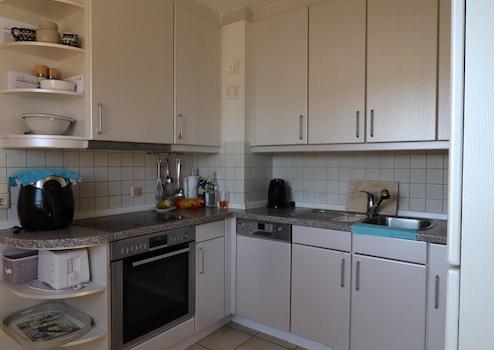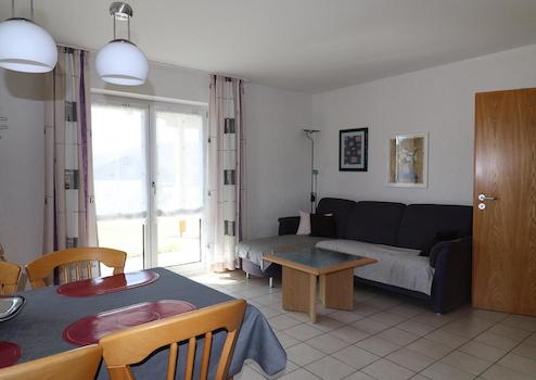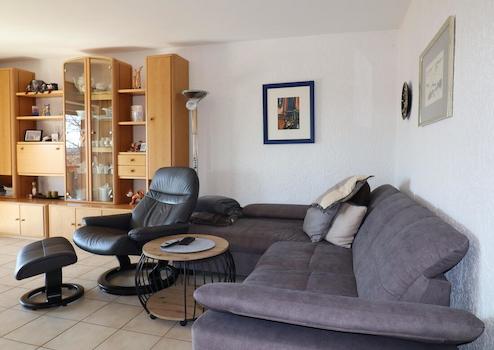 Die große moderne Wohnung hat eine schöne Sonnenterrasse mit Blick in die Natur, einen Balkon und ist mit neuwertigen Möbeln vollständig ausgestattet.