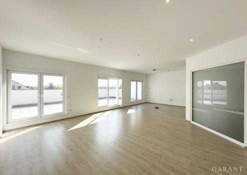 Der lichtdurchflutete Wohn-/Essbereich mit offener Küche lädt zum Entspannen und Genießen ein. Von hier aus haben Sie direkten Zugang zur beeindruckenden Dachterrasse mit über 78 qm Fläche in Süd-/West-Ausrichtung, perfekt, um die Sonne und den Blick in die Ferne zu genießen.