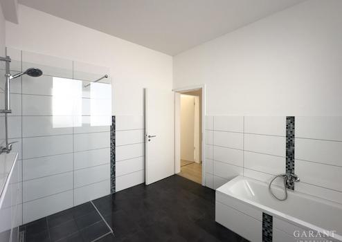 * ein hochmodernes Tageslicht-Bad mit Badewanne und WC,