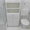 Laminatboden in Diele und Wohnraum, helle Fliesen im Duschbad,