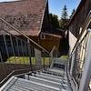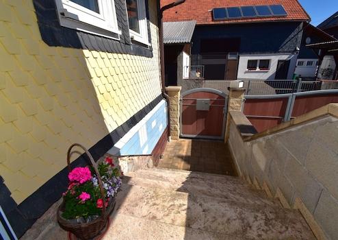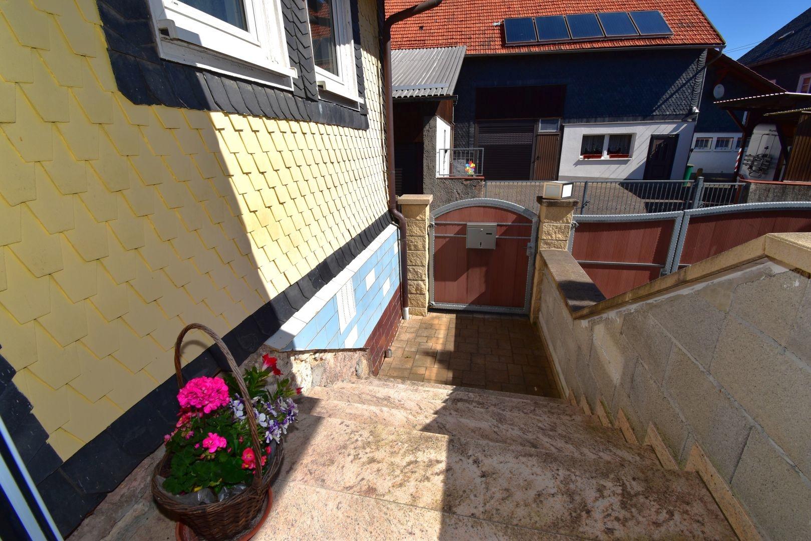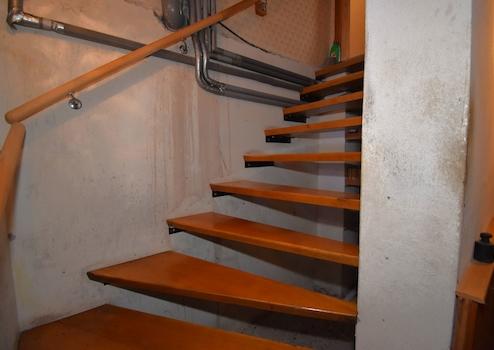 Zugang zum Keller = Holzstufen, einseitiger Holzhandlauf