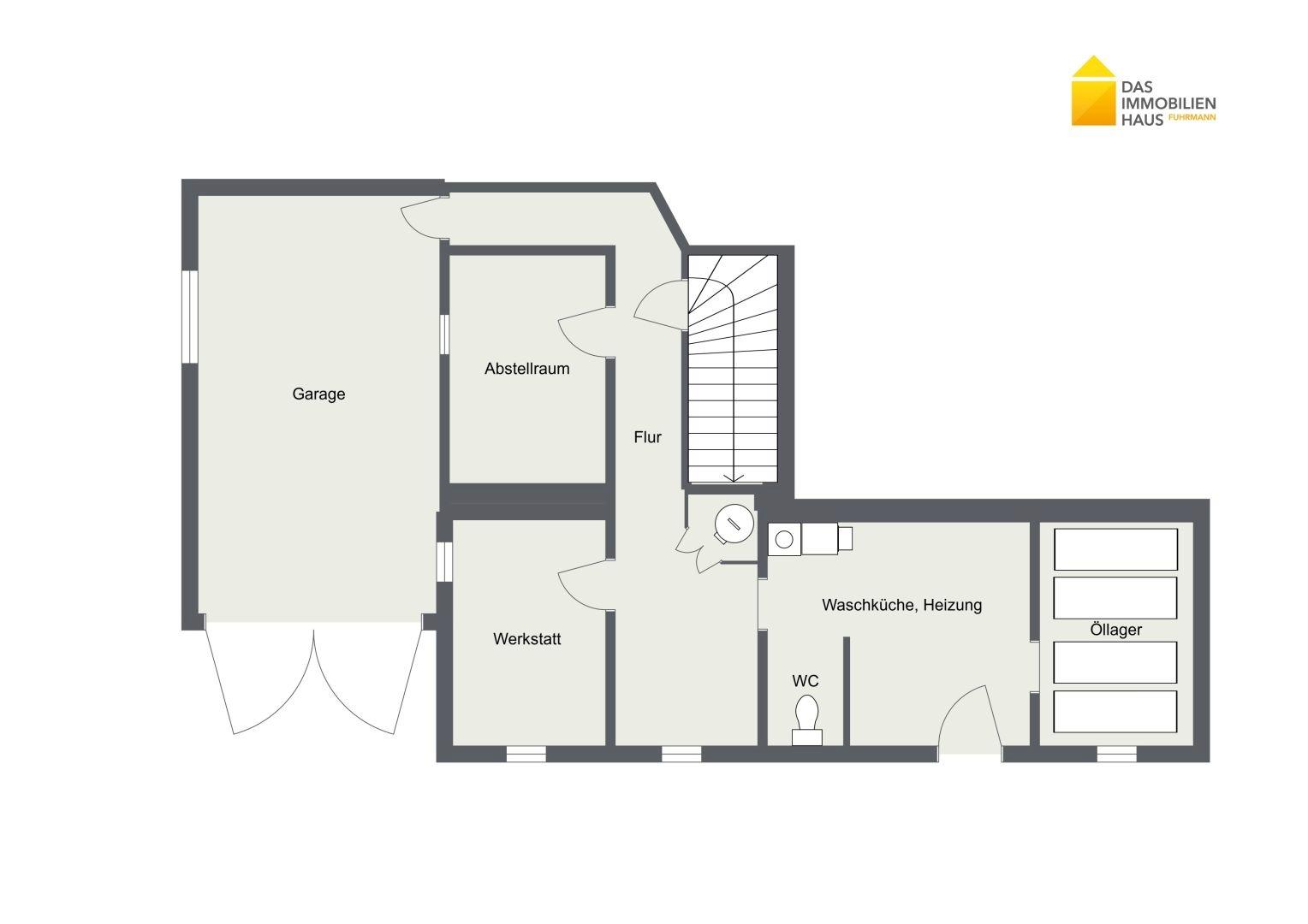 Kellergeschoss: Flur, Abstellraum, Heizungskeller, Waschküche, Werkstatt, Öllager, Garage