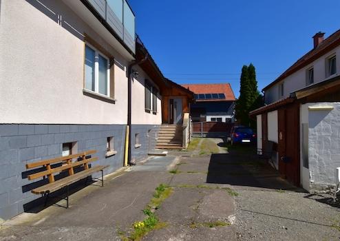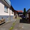 Innenhof teilweise begrünt, teilweise mit Betonplatten oder Schotter