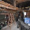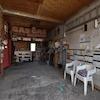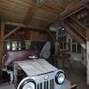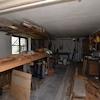 Fachwerkscheune als Werkstatt, ausgemauertes Fachwerk mit Holztoren, teilweise mit Glasausschnitt