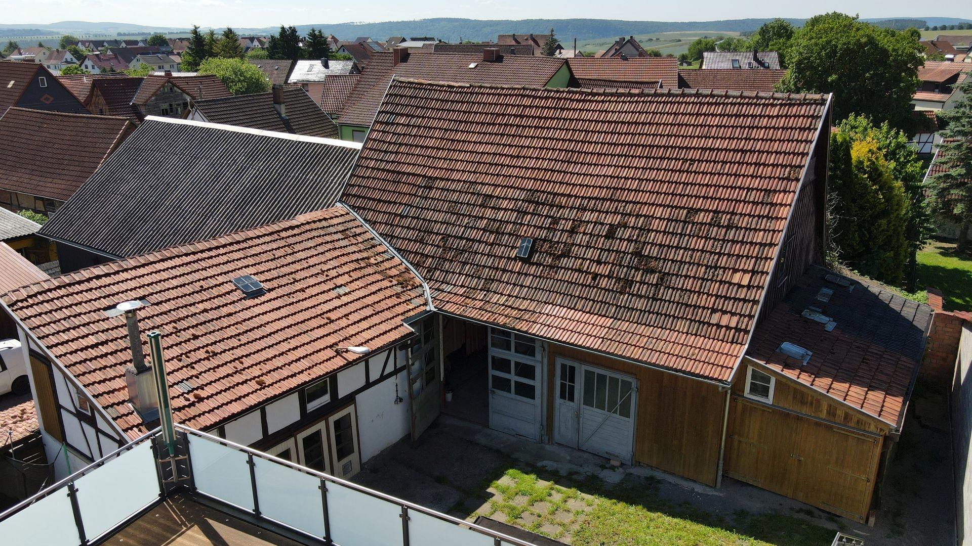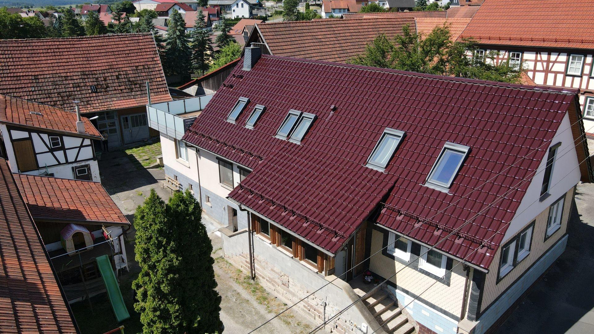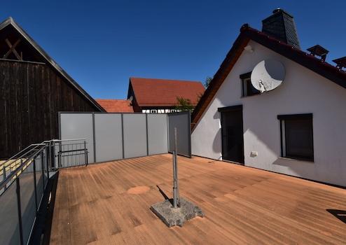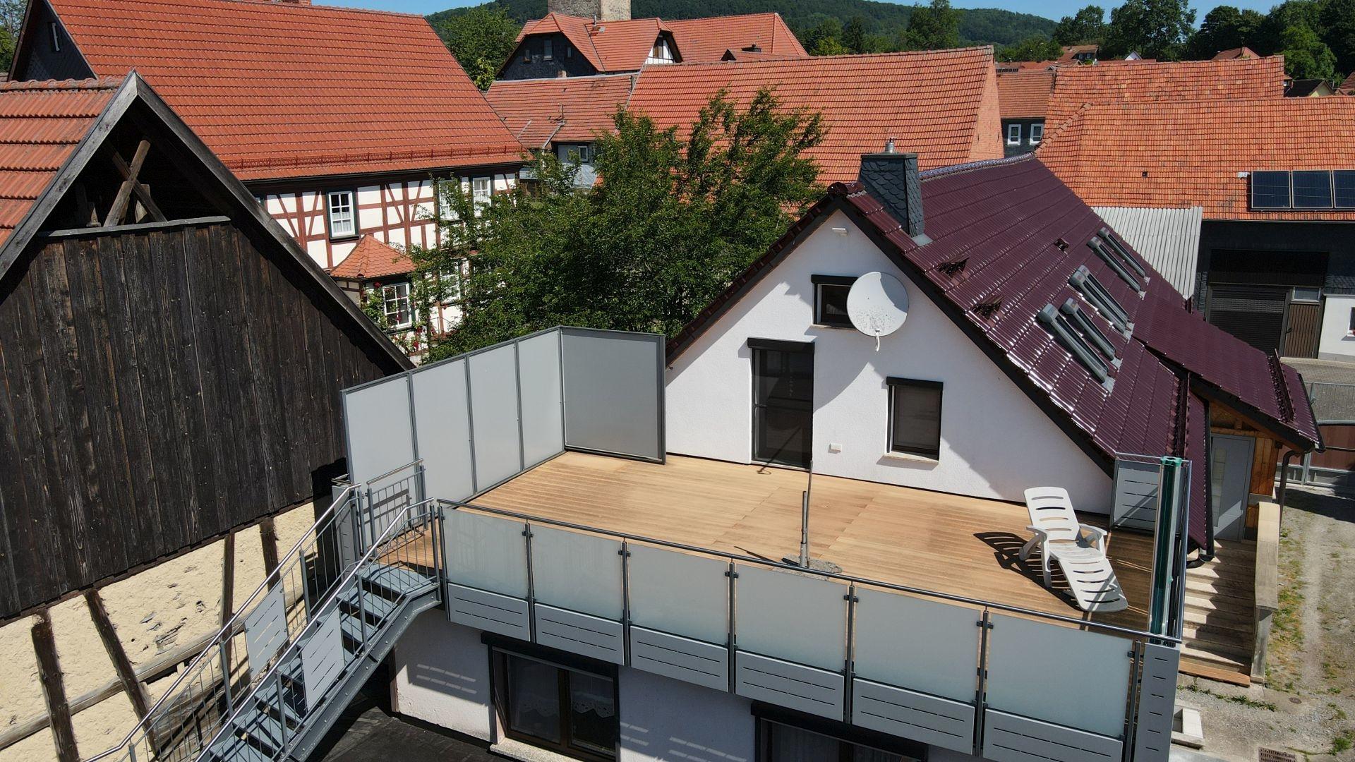 Dachgeschoss: Flur, Zimmer, Schlafzimmer, Küche, Wohnzimmer, Bad, Dachterrasse (mit Zugang in den Hof)